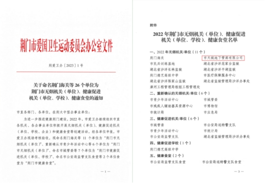 近日,荊門(mén)市愛(ài)衛(wèi)辦授予天城地下管廊有限公司“2022年無(wú)煙單位”榮譽(yù)稱號(hào)。