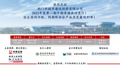 1月20日,市城控集團(tuán)直屬子公司市城投公司成功發(fā)行了2022年度第一期中期票據(jù)10億元,票面利率3.55%,期限5(3+2)年,全場認(rèn)購倍數(shù)2.5倍,創(chuàng)全國同評級、同期限協(xié)會產(chǎn)品歷史最低利率,保障了春節(jié)下場資金及一季度還本付息資金。